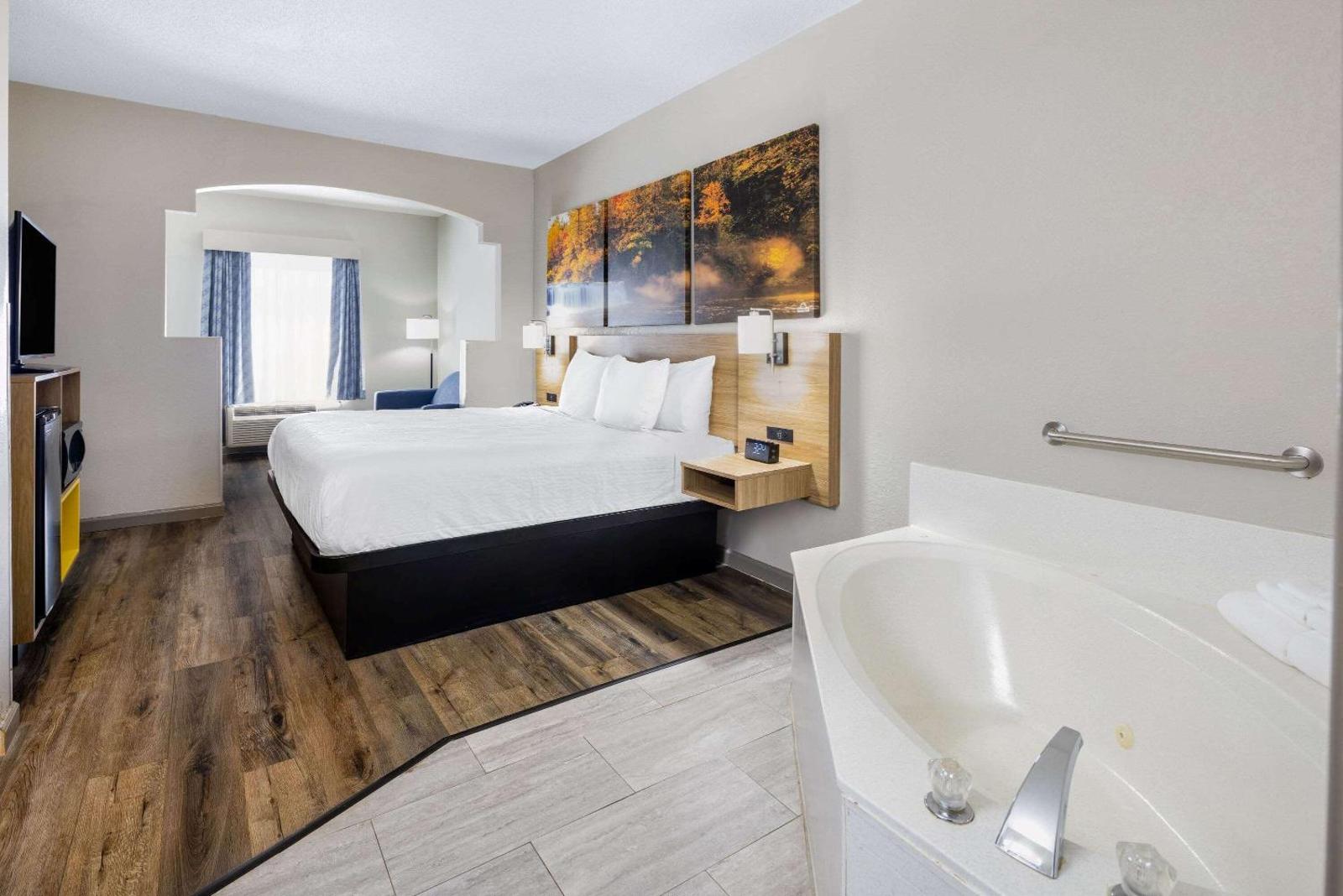The Days Inn by Wyndham Jackson gallery captures the charm of small-town Georgia stays—bright, tidy rooms with classic décor, an inviting outdoor pool surrounded by trees, and a sunny breakfast area where guests start their day. The exterior showcases the signature Days Inn sunburst signage, welcoming travelers to rest between Atlanta and Macon.